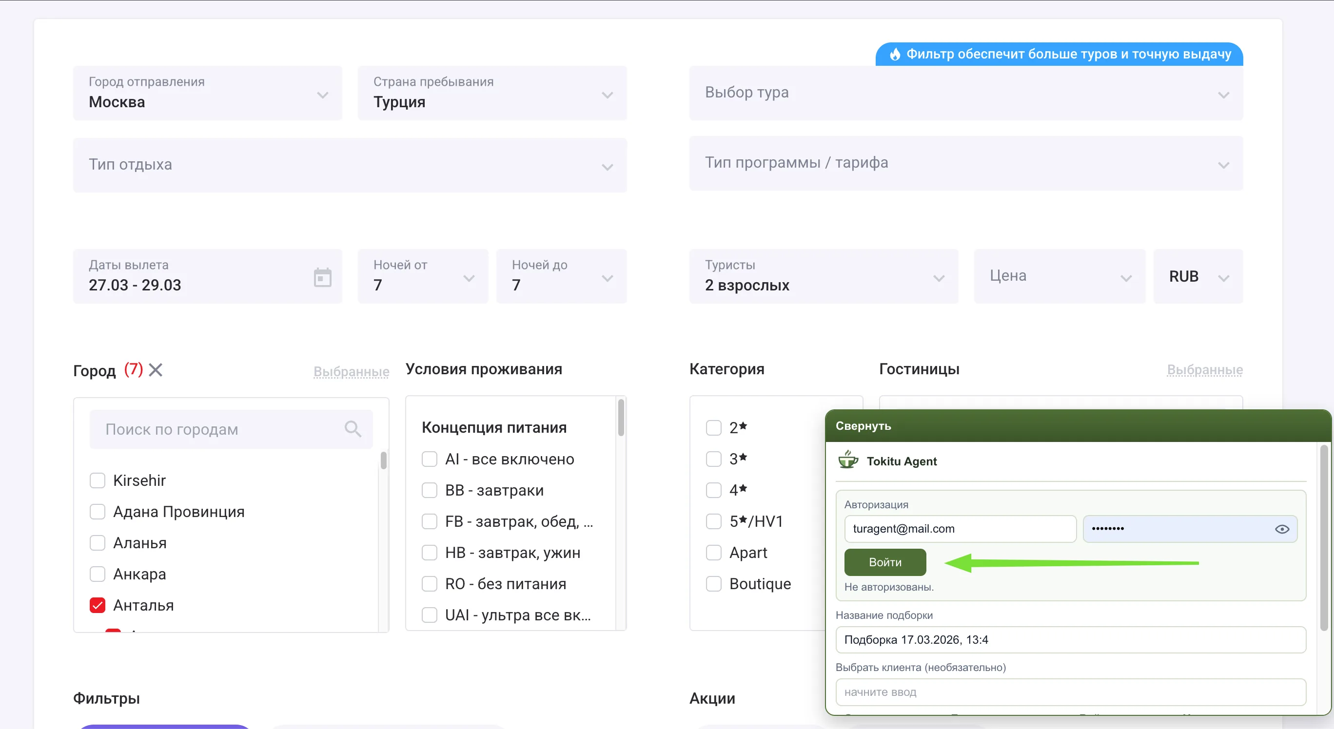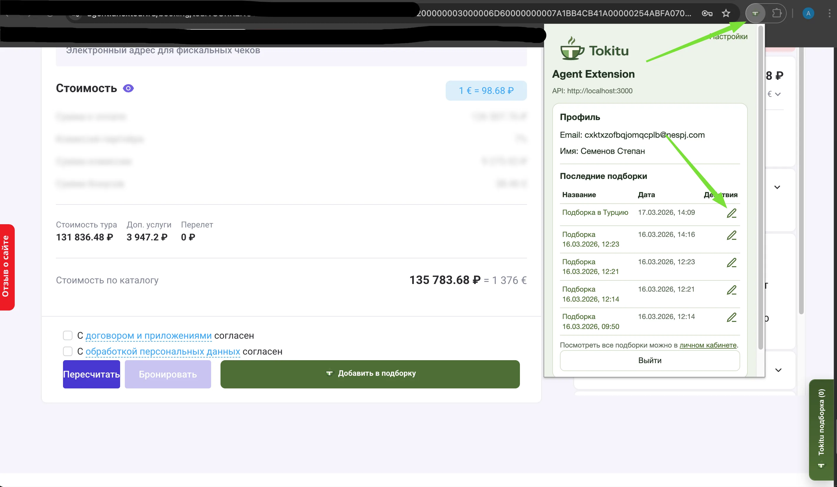Покажем реальный сценарий: авторизация в расширении, добавление тура с сайта туроператора и дальнейшая работа с подборкой.