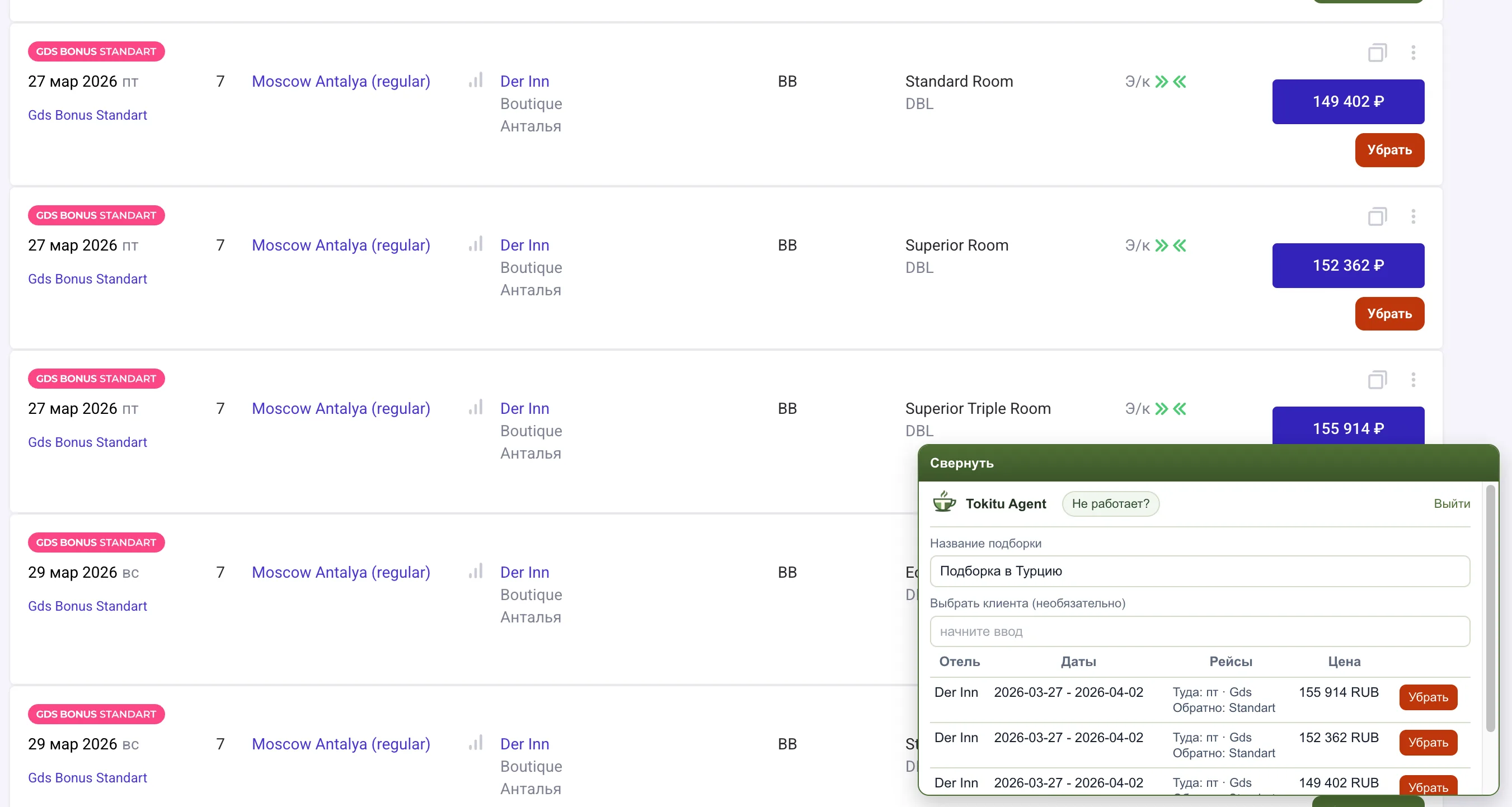 Это удобно для агентств и частных турагентов: расширение помогает не копировать вручную цены, отели и параметры тура, а сразу переносить их в рабочую подборку.
