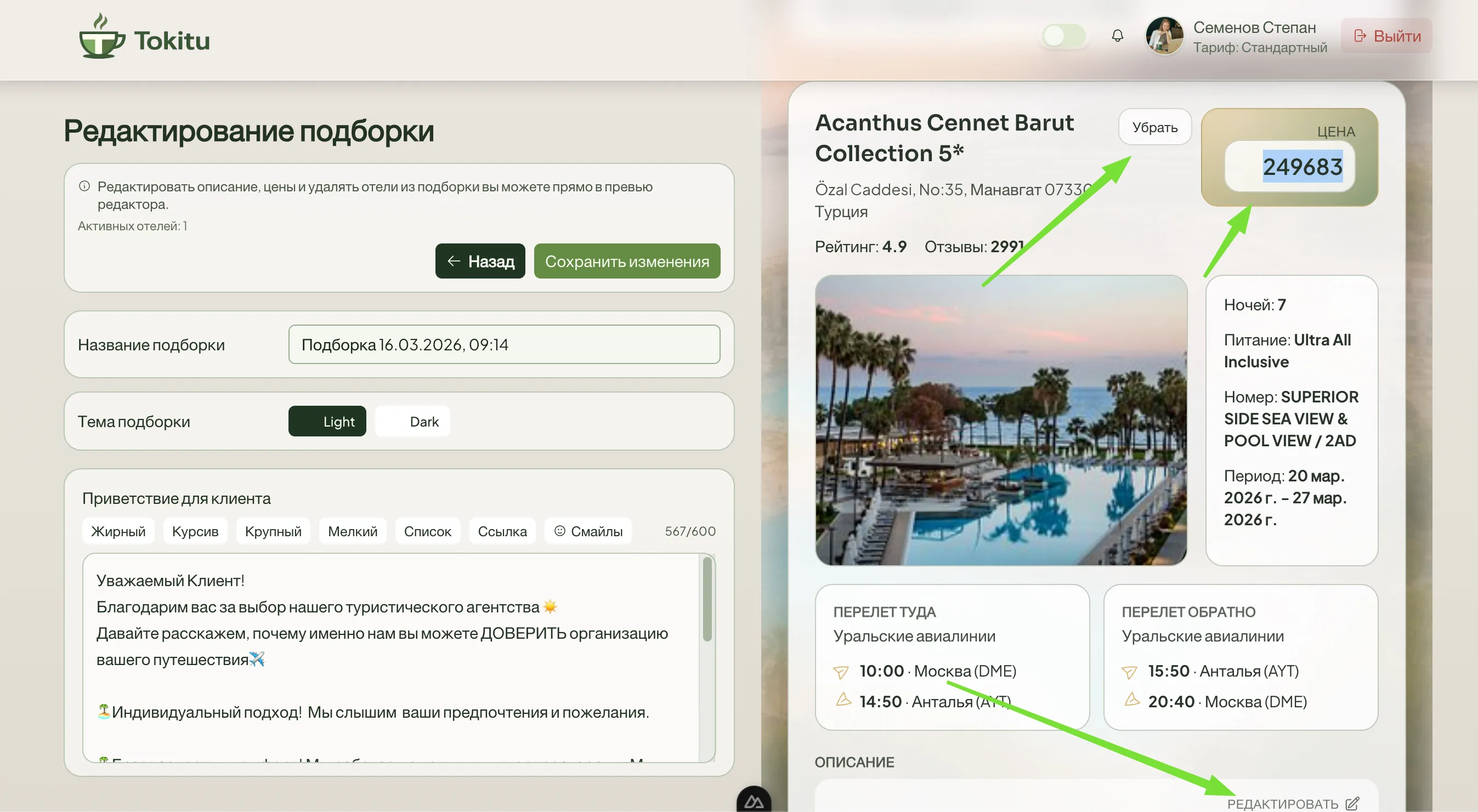 В Tokitu вы формируете подборку туров просто: редактируете описание и цену прямо в превью, переключаете оформление и сразу видите финальный вид страницы глазами туриста.