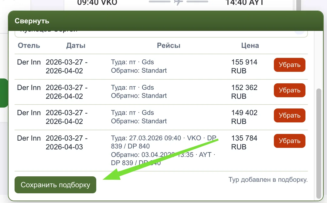 Даже если тур был найден на сайте туроператора, вы можете быстро перенести варианты в свою рабочую подборку и отправить клиенту в структурированном виде.